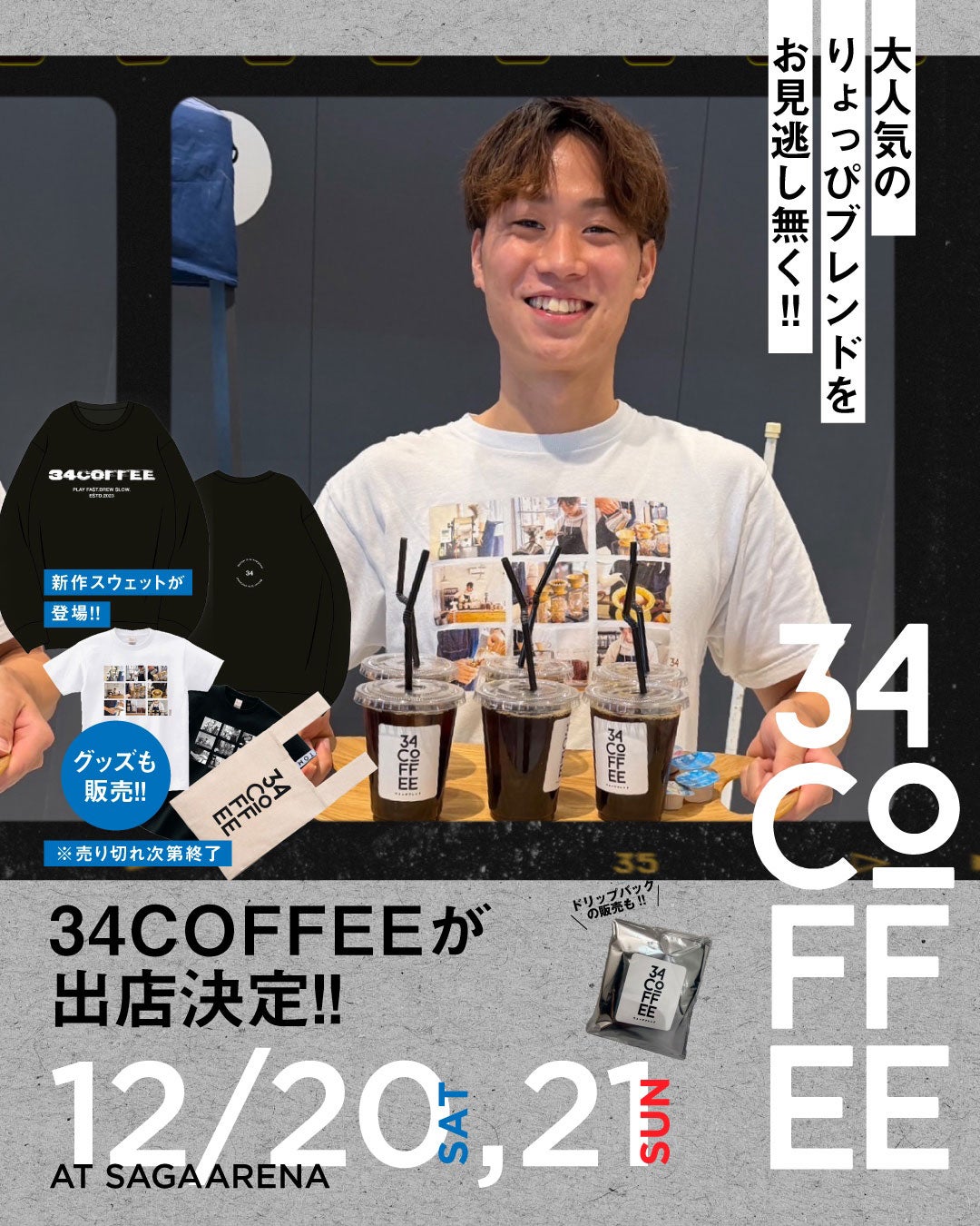 12/20(土)・21(日)の横浜BC戦にて、『34COFFEE』の出店が決定!大人気のコーヒーの販売はもちろん、新作のスウェットが登場! ※ 34COFFEEの売り上げの一部は医療的ケア児のために寄付いたします