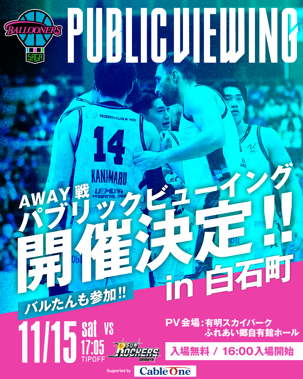 この度、白石町ご協力のもと、11月15日(土)にサンロッカーズ渋谷戦GAME1のパブリックビューイングを開催いたします。