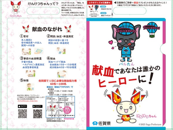 当日は佐賀県薬務課ご協力のもと、けんけつちゃんと佐賀バルーナーズのコラボクリアファイルを先着6,000名に配布いたします!