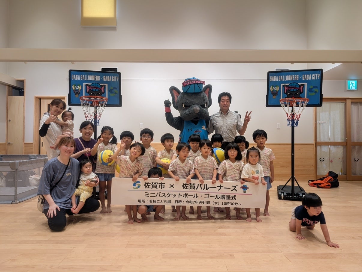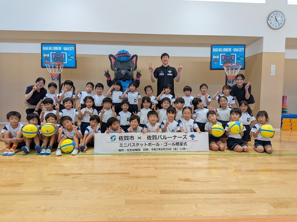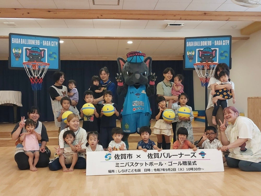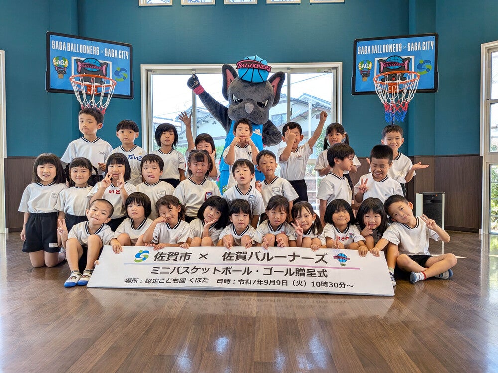 このたび、佐賀バルーナーズでは、昨年度に引き続き、佐賀市と佐賀バルーナーズの連携事業として、佐賀市内の教育・保育施設を対象に、室内用ミニバスケットゴール・ボールを贈呈します。