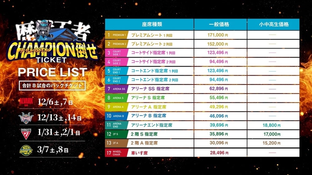 本チケットは、Bリーグの歴代王者に挑む注目のホームゲーム8試合をお得にご観戦いただける特別パックです!臨場感あふれるお席は特に人気が予想されますので、ぜひお早めにお買い求めください。