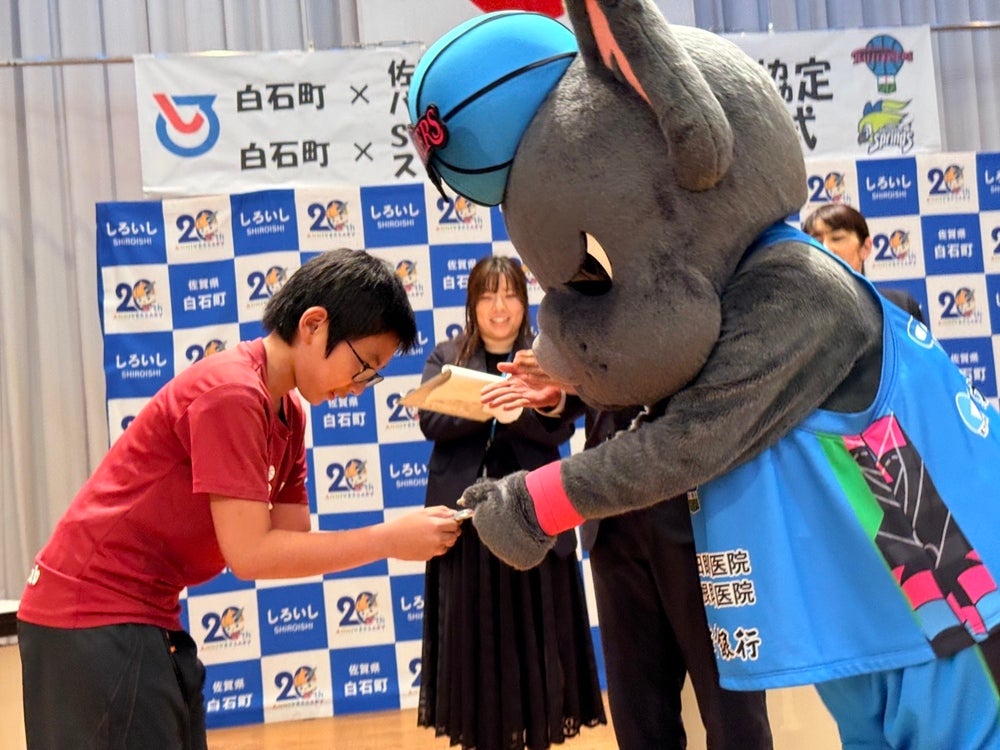 また、当日は白石町とSAGA久光スプリングスさまとの連携協定も同会場で行われ、地域に根ざしたスポーツ推進の輪が一層広がる機会となり、最後には両クラブチームより白石町で活動するミニバスケットボールチーム、バレーボールチームの皆さまへグッズの抽選会も実施しました 。