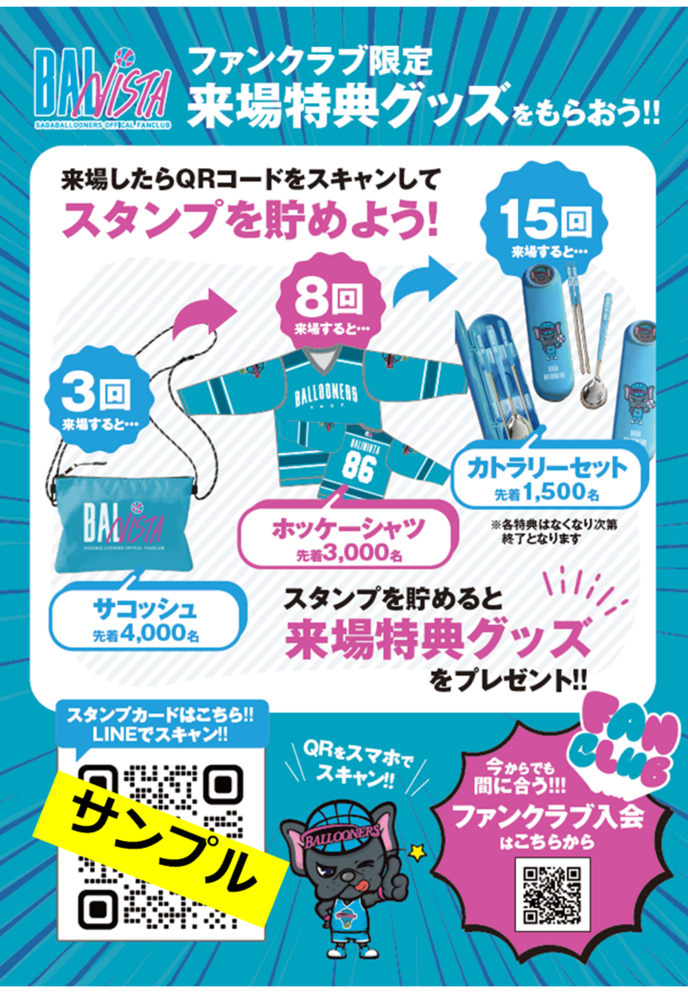 ※ご来場の皆さまにご参加いただけますが、ファンクラブ会員でない方には特典をお渡しできません。佐賀バルーナーズ公式ファンクラブにご入会後、特典交換をお願いいたします。