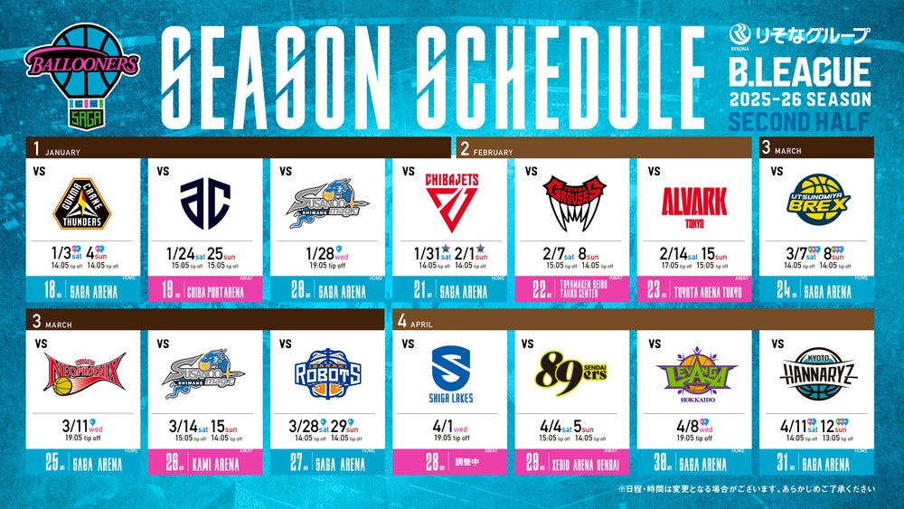 このたび佐賀バルーナーズでは、りそなグループ B.LEAGUE 2025-26シーズン 第31節 佐賀バルーナーズ vs.京都ハンナリーズ(GAME2)の試合時間が下記のとおり変更となりましたのでお知らせいたします。