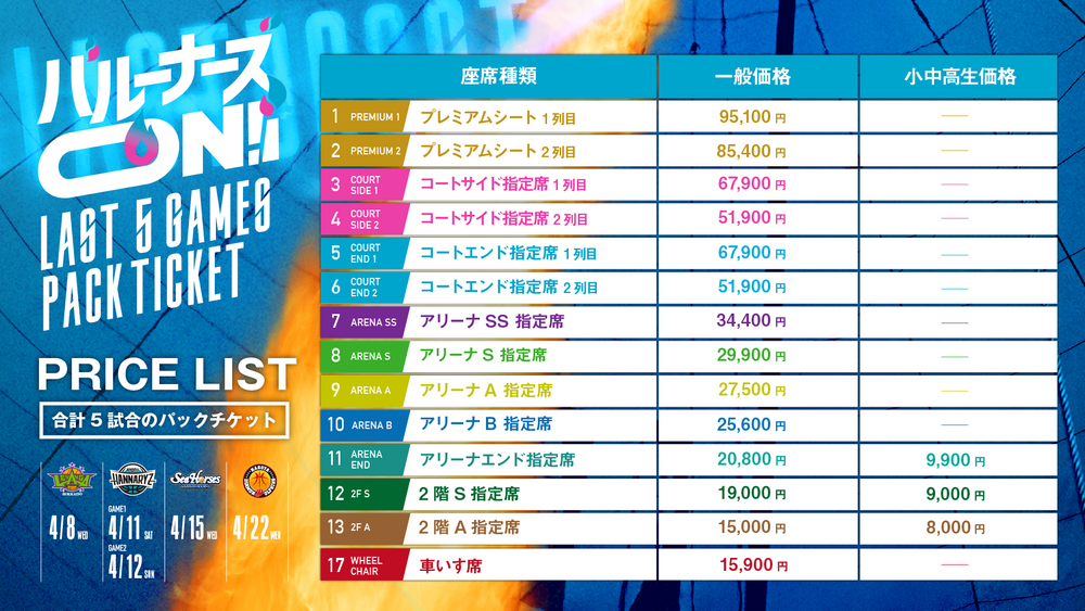 ※上記5試合のパックチケットです。5試合とも同じ座席になります。