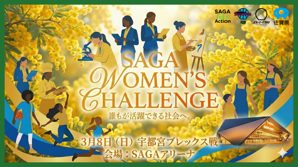 佐賀バルーナーズでは、クラブ公式の社会貢献プロジェクト「SAGA Take Action」の第8弾として、佐賀県男女参画・女性の活躍推進課と連携し「SAGA WOMEN'S CHALLENGE」を開催いたします。