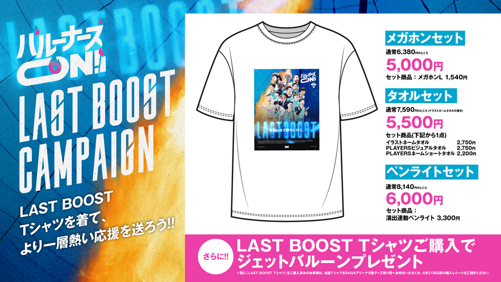 ※既に「LAST BOOST Tシャツ」をご購入済みのお客さまは、当該TシャツをSAGAアリーナ2階グッズ売り場へお持ちいただくか、4月21日以前の購入レシートをご提示ください。