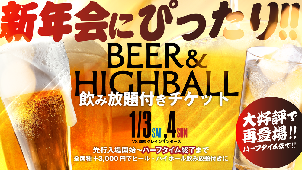 大好評につき1月3日(土)・4日(日)群馬クレインサンダーズ戦でも飲み放題付きチケットを実施することが決定しました。