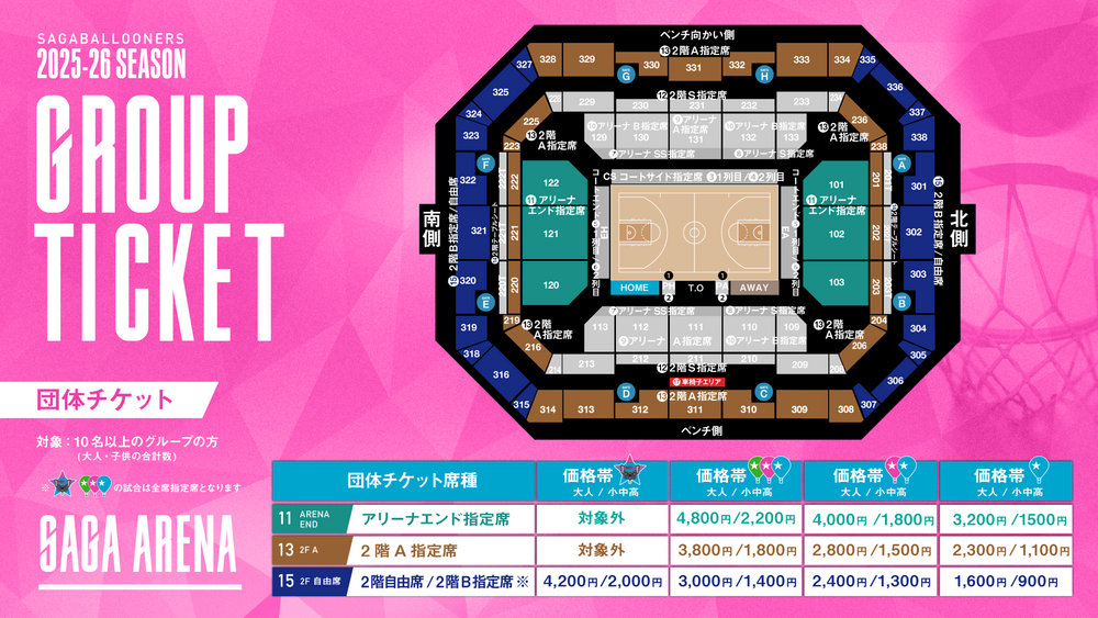 千葉ジェッツ戦は2階B指定席のみ団体チケットの対象となりますので、あらかじめ了承ください。